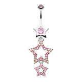 With three luscious colours to choose from, our cute Star Show Ground belly rings feature a trio drop of stars. The first star forms the base of the belly bar, accentuated with a round cubic zirconia gem. The final two star pendants have been micro paved in bold colours and finished with mini aurora borealis tips.