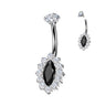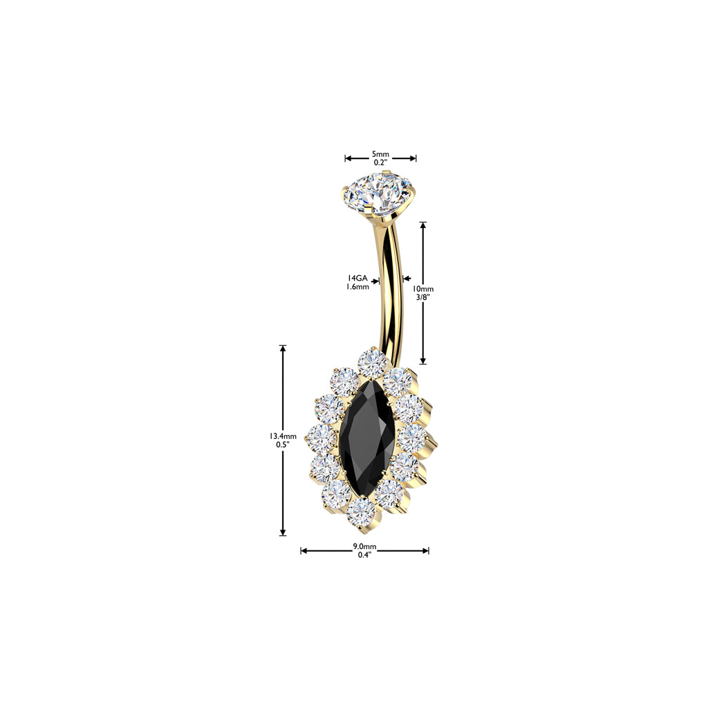Turn heads after dark with the Midnight Mirage, a luxurious titanium belly ring designed to captivate. This premium belly piercing features a marquise-cut black gemstone framed by a micro pave of clear crystals, creating a shimmering illusion that dances with every movement. The implant grade titanium belly bar is internally threaded for a smooth, secure fit, making it ideal for everyday wear or special occasions.