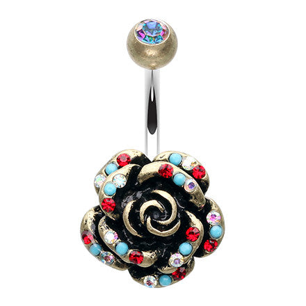This vintage style belly button ring features a bohemian design by combining a delicate paving of aurora borealis and turquoise gems that glitter the petals of the nature inspired garden rose.