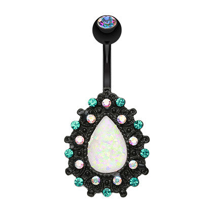 This impressive navel bar features a fixed synthetic opal set on a jet black shine PVD coated setting.